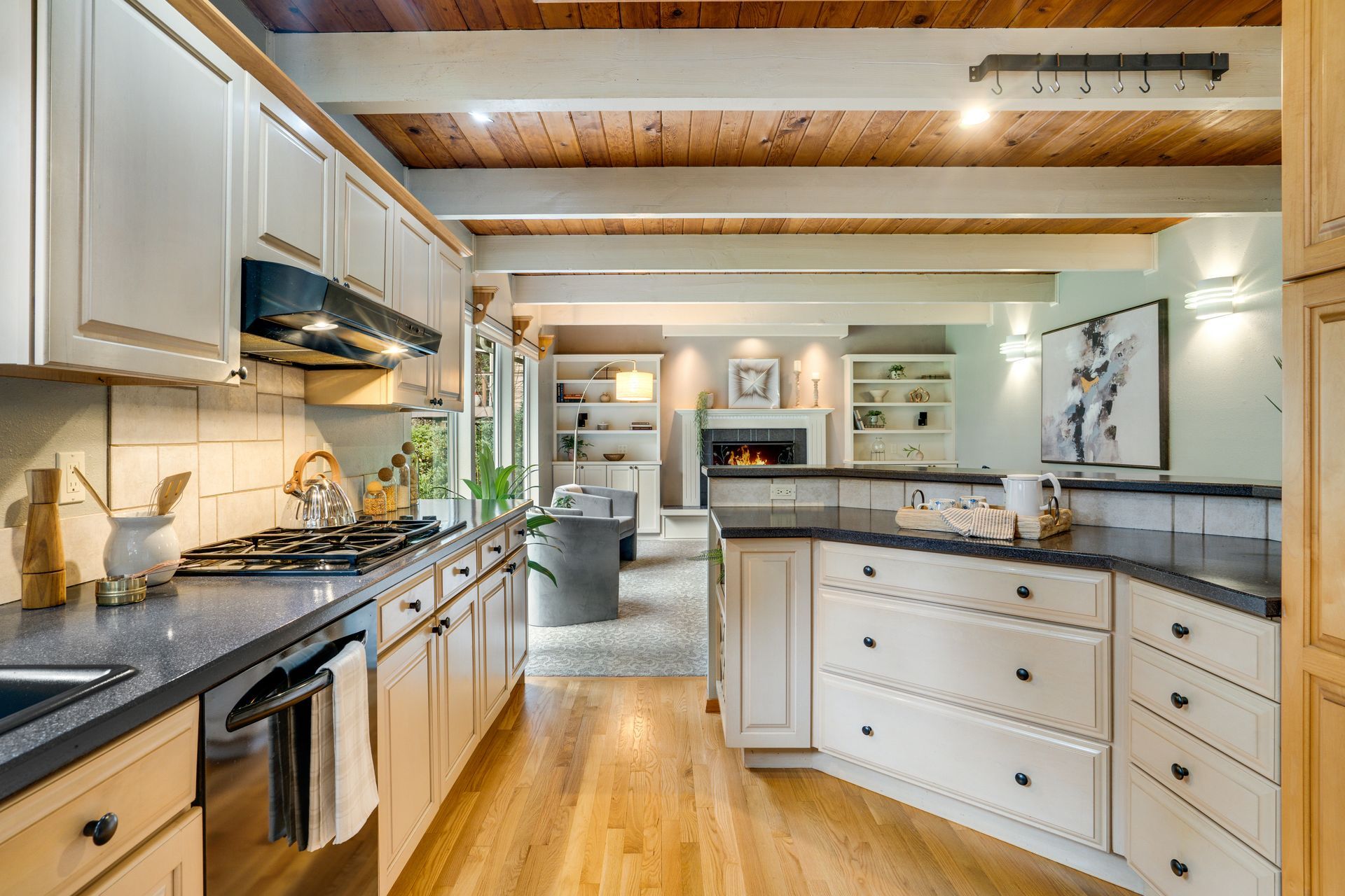 The home itself is equally special. Rich midcentury elements are woven throughout—from vaulted, beamed ceilings to floor-to-ceiling windows that flood the home with natural light. The layout is practical and inviting, designed for real life while still feeling architectural and intentional.